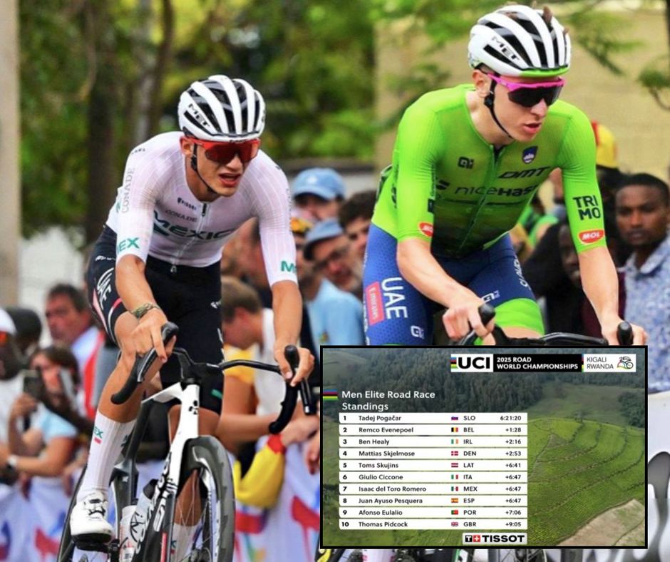 Del Toro protagonizó uno de los momentos más destacados de la jornada al mantenerse más de 30 kilómetros en la punta de la carrera junto al esloveno Tadej Pogacar, quien a la postre se llevó el título. El mexicano, apodado “El Torito”, acompañó a Pogacar en la escapada decisiva que sacudió la prueba, pero finalmente no pudo sostener el ritmo del multicampeón y terminó fuera del podio, asegurando sin embargo un lugar dentro del Top 10 mundial.